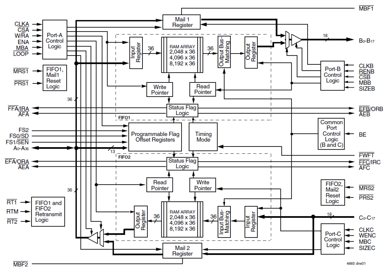 - Two independent FIFOs buffer data between one bidirectional 36-bit port and two unidirectional 18-bit ports