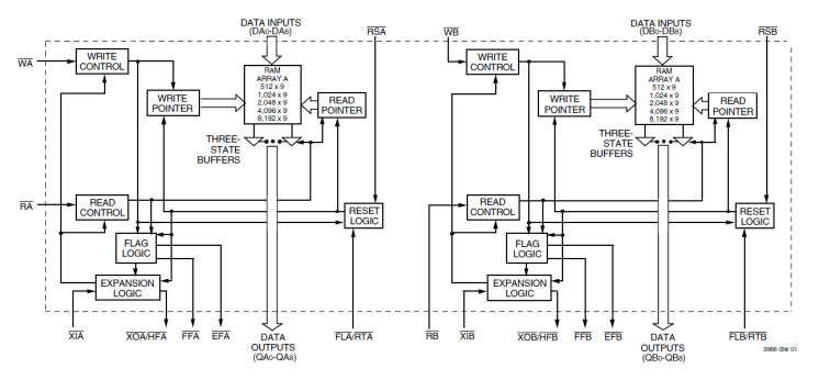 The 72V83 is a dual-FIFO memory that loads and empties data on a first-in/first-out basis. It utilizes a 9-bit wide data array to allow for control and parity bits at the user's option. This is useful in data communications applications where a parity bit is needed for transmission/reception error checking. It is designed for those applications requiring asynchronous and simultaneous read/writes in multiprocessing and rate buffer applications.