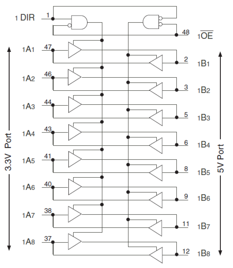 - Typical VOLP (Output Ground Bounce) < 0.9V at VCC1 = 5V, VCC2 = 3.3V, TA = 25 °C