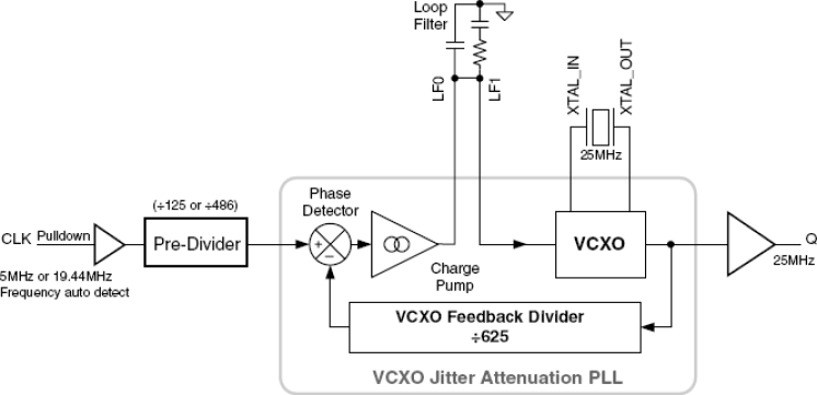 - RMS phase jitter. (12kHz – 5MHz): 0.4ps (typical)