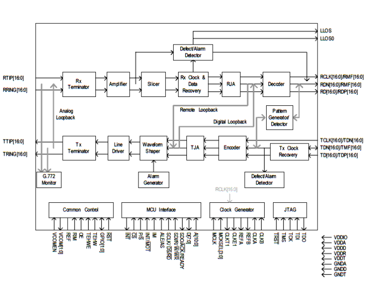 The 82P2816A is a 16 (+1)-channel T1/E1/J1 short haul line interface unit. This device has an integrated adaptive equalizer, performs clock data recovery, line decoding/encoding, and has one jitter attenuator. Optimized to be used in LAN, WAN, routers, wireless base stations, gateways, etc.