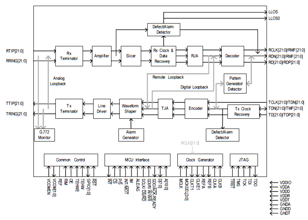 21 (+1)-Channel T1/E1/J1 Short Haul Line Interface Unit. This device has an adaptive equalizer integrated, performs clock.data recovery, line decoding/encoding and has one jitter attenuator. Optimized to be used in LAN, WAN, Routers, Wireless Base Stations, Gateways etc.
