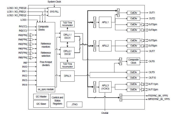 - System-wide precise 1PPS (Pulse Per Second) time of day alignment is supported with programmable input-to-input, input-to-output and output-to-output phase delays: sub-ns resolution