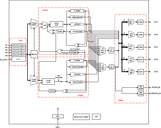 - Provides 5 input clocks whose frequency cover from 2 kHz to 622.08 MHz