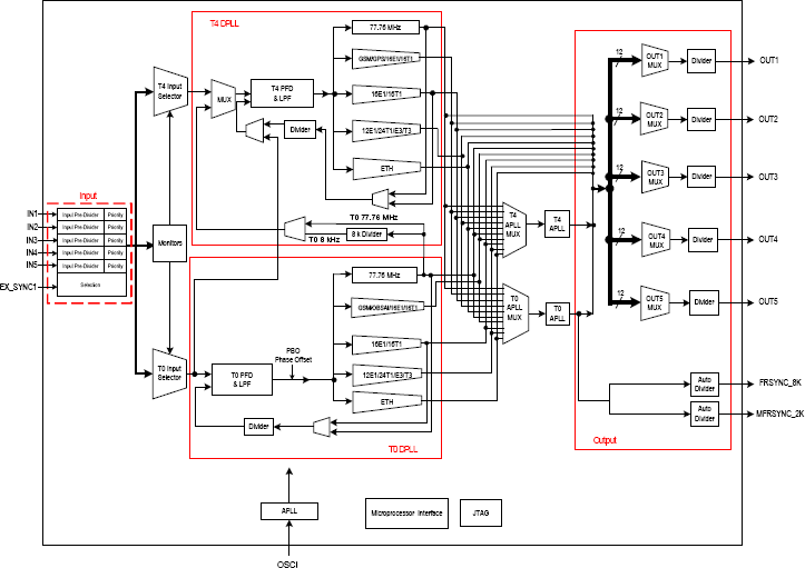 The 82V3389 is an integrated, single-chip solution for the Synchronous Equipment Timing Source for Stratum 3, 4E, 4, EEC-Option 1, EEC-Option 2 and SMC clocks in SONET / SDH / Ethernet equipments, DWDM and Wireless base station, DSL concentrator, Router and Access Network applications. The device supports three types of input clock sources: recovered clock from STM-N or OC-n, PDH network synchronization timing and external synchronization reference timing. The device consists of T0 and T4 paths. The T0 path is a high quality and highly configurable path to provide system clock for node timing synchronization within a SONET / SDH network. The T4 path is simpler and less configurable for equipment synchronization. The T4 path locks independently from the T0 path or locks to the T0 path. An input clock is automatically or manually selected for T0 and T4 each for DPLL locking. Both the T0 and T4 paths support three primary operating modes: Free-Run, Locked and Holdover. In Free-Run mode, the DPLL refers to the master clock. In Locked mode, the DPLL locks to the selected input clock. In Holdover mode, the DPLL resorts to the frequency data acquired in Locked mode. Whatever the operating mode is, the DPLL gives a stable performance without being affected by operating conditions or silicon process variations. If the DPLL outputs are processed by T0/T4 APLL, the outputs of the device will be in a better jitter/wander performance. The device provides programmable DPLL bandwidths: 0.5 MHz to 560 Hz in 19 steps and damping factors: 1.2 to 20 in 5 steps. Different settings cover all SONET / SDH clock synchronization requirements. A high stable input is required for the master clock in different applications. The master clock is used as a reference clock for all the internal circuits in the device. It can be calibrated within ±741 ppm. All the read/write registers are accessed through a microprocessor interface. The device supports five microprocessor interface modes: EPROM, Multiplexed, Intel, Motorola and Serial. In general, the device can be used in Master/Slave application. In this application, two devices should be used together to enable system protection against single chip failure. See Chapter 4 Typical Application for details.