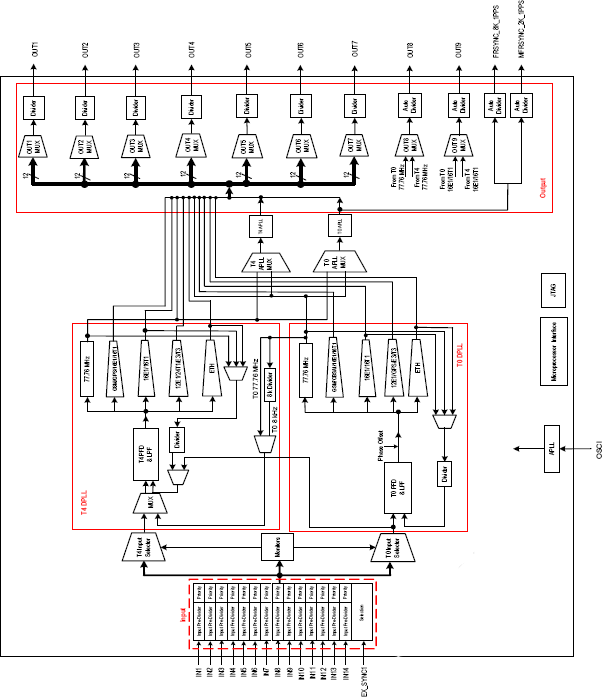 The 82V3391 is an integrated, single-chip solution for the Synchronous Equipment Timing Source for Stratum 3, Stratum 4E, Stratum 4, SMC, EEC-Option1, EEC-Option2 clocks in SONET / SDH / Synchronous Ethernet equipment, DWDM and Wireless base station. The device supports several types of input clock sources: recovered clock from Synchronous Ethernet, STM-N or OC-n, PDH network synchronization timing and external synchronization reference timing. The device consists of T0 and T4 paths. The T0 path is a high quality and highly configurable path to provide system clock for node timing synchronization within a SONET / SDH / Synchronous Ethernet network. The T4 path is simpler and less configurable for equipment synchronization. The T4 path locks independently from the T0 path or locks to the T0 path. An input clock is automatically or manually selected for T0 and T4 path. Both the T0 and T4 paths support three primary operating modes: Free-Run, Locked and Holdover. In Free-Run mode, the DPLL refers to the master clock. In Locked mode, the DPLL locks to the selected input clock. In Holdover mode, the DPLL resorts to the frequency data acquired in Locked mode. Whatever the operating mode is, the DPLL gives a stable performance without being affected by operating conditions or silicon process variations. There are 2 high performance APLLs that can be used for low jitter SONET and Ethernet Clocks The device provides programmable DPLL bandwidths: 0.5 mHz to 560 Hz in 19 steps and damping factors: 1.2 to 20 in 5 steps. Different settings cover all SONET / SDH clock synchronization requirements. A highly stable input is required for the master clock in different applications. The master clock is used as a reference clock for all the internal circuits in the device. It can be calibrated within ±741 ppm. All the read/write registers are accessed through a microprocessor interface. The device supports six microprocessor interface modes: EPROM, Multiplexed, Intel, Motorola, I2C and Serial. In general, the device can be used in Master/Slave application. In this application, two devices should be used together to enable system protection against single chip failure.