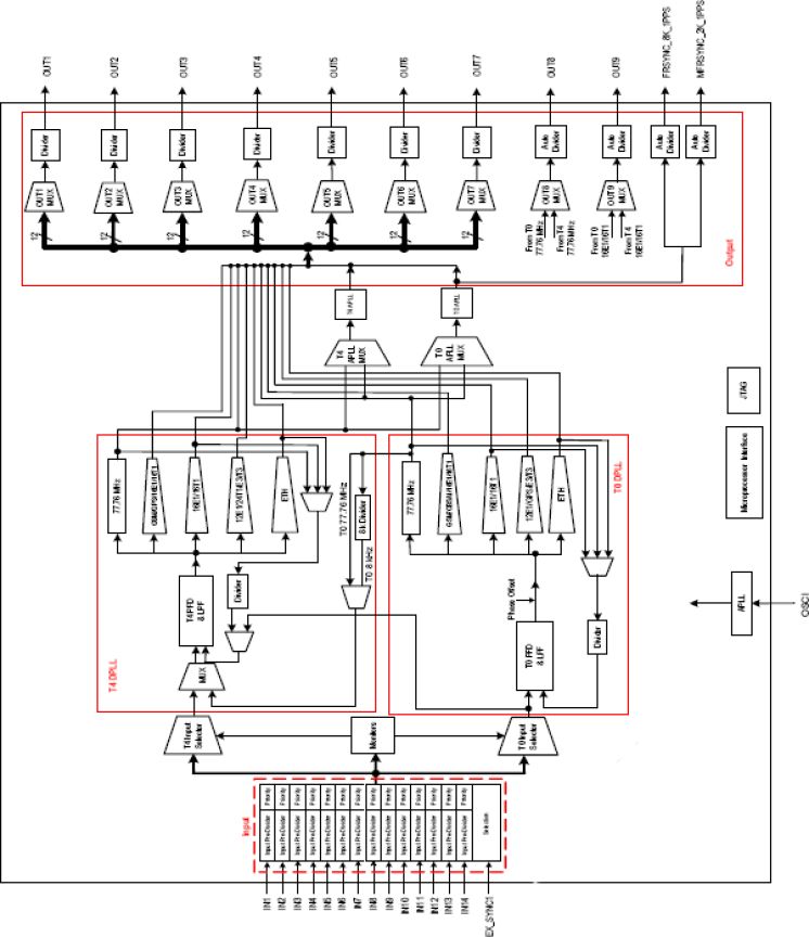 - Supports hitless reference switching to minimize phase transients on T0 DPLL output to be no more than 0.61 ns