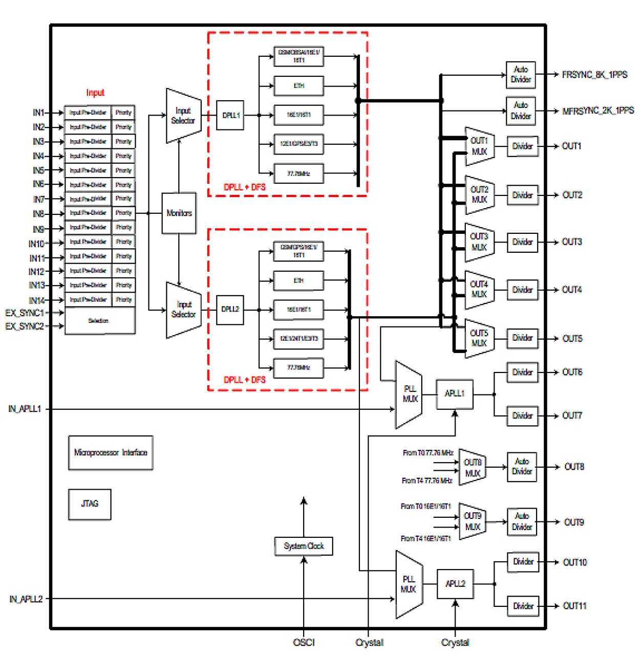 - Integrates T4 DPLL and T0 DPLLs per ITU-T G.8264