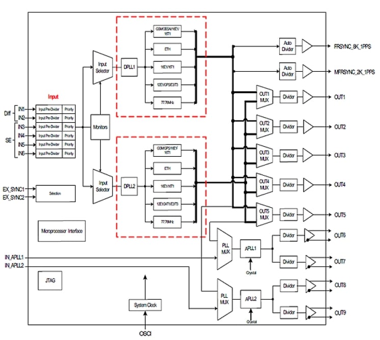 - Integrates 2 DPLLs, one for the transmit path and one for the receive path