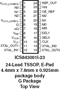 The 843001I-23 is a highly versatile, low phase noise LVPECL/LVCMOS synthesizer that can generate low jitter reference clocks for a variety of communication applications. The dual crystal interface allows the synthesizer to support up to three communication standards in a given application (i.e. SONET with a 19.44MHz crystal, 1Gb/10Gb Ethernet and Fibre Channel using a 25MHz crystal). The RMS phase jitter performance is typically less than 1ps, thus making the device acceptable for use in demanding applications such as OC48 SONET, GbE/10Gb Ethernet and SAN applications. The 843001I-23 is packaged in a small 24-pin TSSOP, E-Pad package.