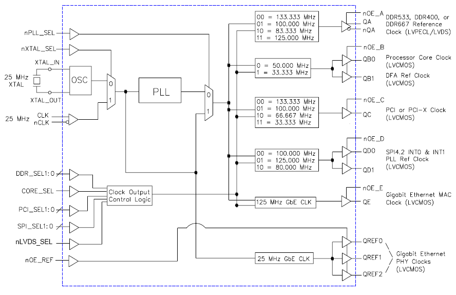 - One selectable differential output pair for DDR 533/400/667, LVPECL, LVDS interface levels