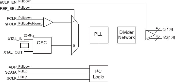 The 843S304I-100 is a PLL-based clock generator specifically designed for low phase noise applications. This device generates a 100MHz differential LVPECL clock from a input reference of 25MHz. The input reference may be derived from an external source or by the addition of a 25MHz crystal to the on-chip crystal oscillator. An external reference is applied to the PCLK pins. The nominal output frequency of 100MHz may be margined by approximately ±5% by changing the M divider value via the I2C interface. The device offers spread spectrum clock output for reduced EMI applications. An I2C bus interface is used to enable or disable spread spectrum operation as well as set the amount of spread. The 843S304I-100 is available in a lead-free 32-Lead VFQFN package.