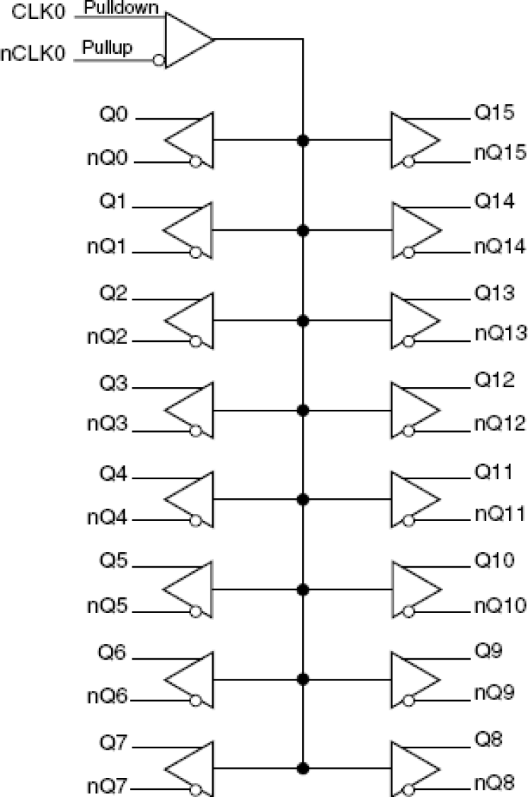 - Sixteen differential LVPECL output pairs