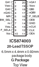 The 874003 is a high performance Differential-to-LVDS Jitter Attenuator designed for use in PCI Express® systems. In some PCI Express® systems, such as those found in desktop PCs, the PCI Express® clocks are generated from a low bandwidth, high phase noise PLL frequency synthesizer. In these systems, a jitter attenuator may be required to attenuate high frequency random and deterministic jitter components from the PLL synthesizer and from the system board. The 874003 has 3 PLL bandwidth modes: 200kHz, 400kHz, and 800kHz. The 200kHz mode will provide maximum jitter attenuation, but with higher PLL tracking skew and spread spectrum modulation from the motherboard synthesizer may be attenuated. The 400kHz provides an intermediate bandwidth that can easily track triangular spread profiles, while providing good jitter attenuation. The 800kHz bandwidth provides the best tracking skew and will pass most spread profiles, but the jitter attenuation will not be as good as the lower bandwidth modes. Because some 2.5Gb serdes have x20 multipliers while others have than x25 multipliers, the 874003 can be set for 1:1 mode or 5/4 multiplication mode (i.e. 100MHz input/125MHz output) using the FSEL pins. The 874003 uses IDT's 3rd Generation FemtoClock® PLL technology to achieve the lowest possible phase noise. The device is packaged in a 20 Lead TSSOP package, making it ideal for use in space constrained applications such as PCI Express® add-in cards.