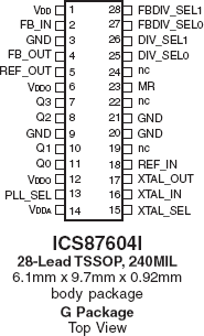 The 87604I is a 1:4 PCI/PCI-X Clock Generator. The 87604I has a selectable REF_IN or crystal input. The REF_IN input accepts LVCMOS or LVTTL input levels. The 87604I has a fully integrated PLL along with frequency configurable clock and feedback outputs for multiplying and regenerating clocks with "zero delay". The PLL's VCO has an operating range of 250MHz - 500MHz, allowing this device to be used in a variety of general purpose clocking applications. For PCI/PCI-X applications in particular, the VCO frequency should be set to 400MHz. This can be accomplished by supplying 33.33MHz, 25MHz, 20MHz, or 16.66MHz on the reference clock or crystal input and by selecting ÷12, ÷16, ÷20, or ÷24, respectively as the feedback divide value. The divider on the output bank can then be configured to generate 33.33MHz (÷12), 66.66MHz (÷6), 100MHz (÷4), or 133.33MHz (÷3). The 87604I is characterized to operate with its core supply at 3.3V and the bank supply at 3.3V or 2.5V. The 87604I is packaged in a small 6.1mm x 9.7mm TSSOP body, making it ideal for use in space-constrained applications.