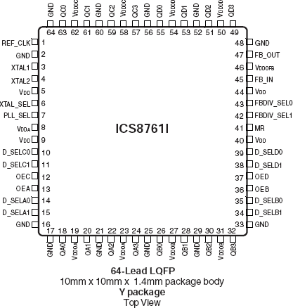 The 8761I is a low voltage, low skew PCI / PCI-X clock generator. The 8761I has a selectable REF_CLK or crystal input. The REF_CLK input accepts LVCMOS or LVTTL input levels. The 8761I has a fully integrated PLL along with frequency configurable clock and feedback outputs for multiplying and regenerating clocks with "zero delay". Using a 20MHz or 25MHz crystal or a 33.333MHz or 66.666MHz reference frequency, the 8761I will generate output frequencies of 33.333MHz, 66.666MHz, 100MHz and 133.333MHz simultaneously. The low impedance LVCMOS/LVTTL outputs of the 8761I are designed to drive 50Ω series or parallel terminated transmission lines.