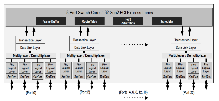 Provides 32 PCIe Gen2 lanes and 8 ports of high-performance, deterministic system interconnect switching. All ports receive full line rate, non-blocking throughput for multiple traffic flows regardless of switch loading.
