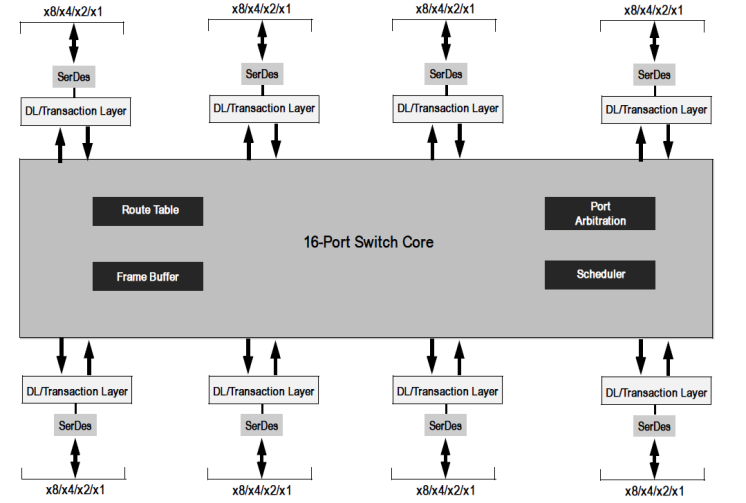 Provides 64 PCIe Gen2 lanes and 16 ports of high-performance, deterministic system interconnect switching. All ports receive full line rate, non-blocking throughput for multiple traffic flows regardless of switch loading.
