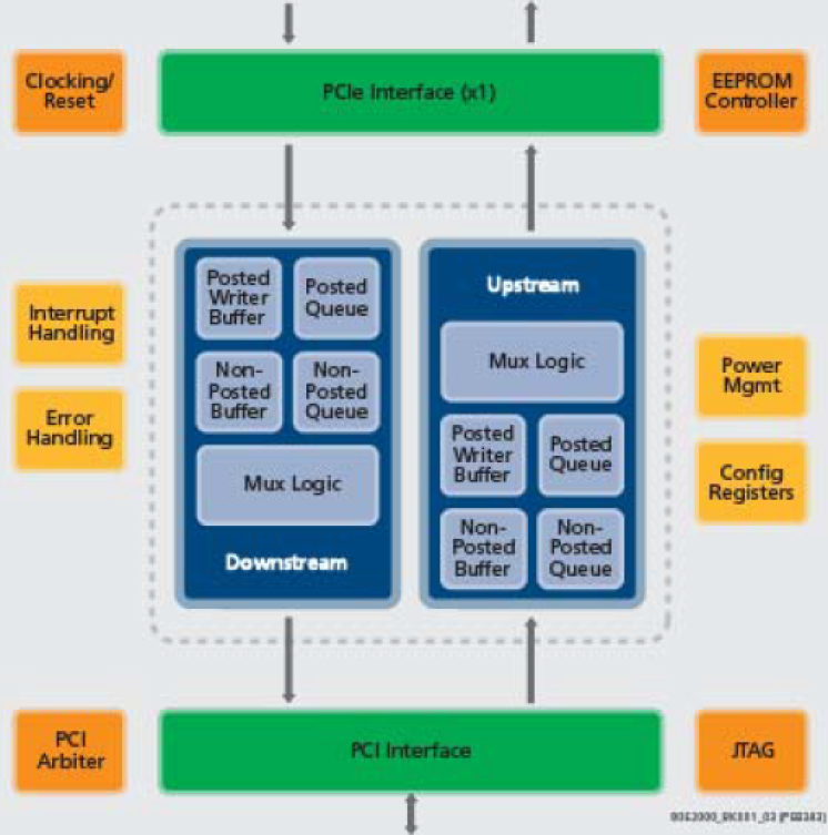 The 89HPEB383 provides a high performance, small footprint bridge from single lane PCI Express to 32 bit PCI. The device's PCI interface can operate up to 66 MHz. Three types of addressing modes are supported; transparent, opaque and non-transparent, giving designers flexibility.
