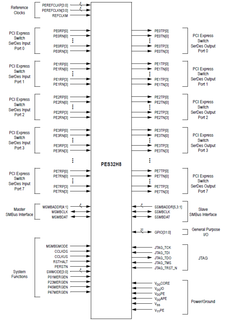 - 32 PCIe Gen1 Lanes, 8 Switch Ports