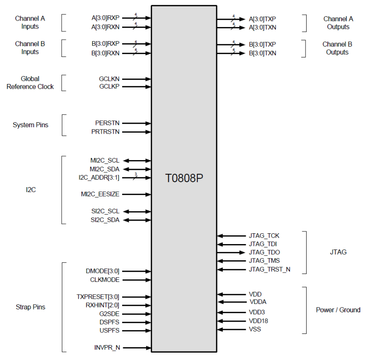 - 8 channel PCIe Gen3 signal retimer (4 PCIe Gen3 lanes)