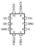 Unique to this family is IDT's new 10-lead 5x7 package. Pins one, two, three, and six, seven, and eight are the industry standard 5x7 footprint, used by all single-ended and differential oscillators on the market today. This allows IDT to use the same landing pattern as traditional oscillators. For some customers, this has become important, since the tsunami in Japan and rains in Thailand. The 10-lead package offered by IDT has additional flexibility, in terms of two frequency select pins, which allow the end-user to manually select between the four pre-programmed frequencies, and on certain devices, the ability to reprogram the default frequencies via I2C interface.