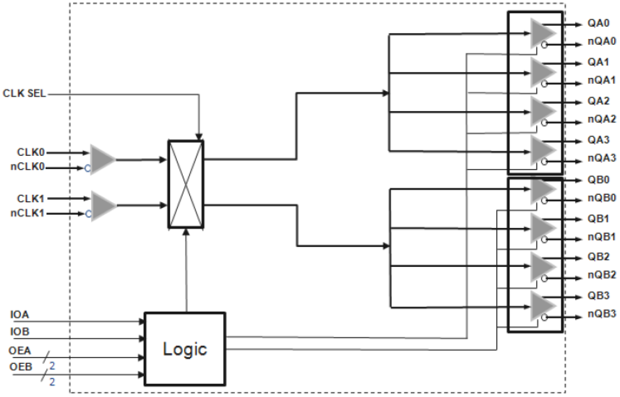 - Generates 8 differential or 16 LVCMOS outputs