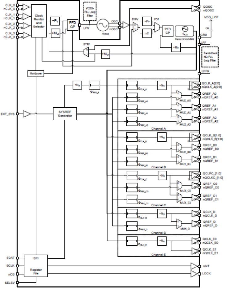 该器件支持从所选 VCO 和低频同步信号(SYSREF)生成高频时钟。 SYSREF 信号在内部与时钟信号同步。 另外还具有延时功能,可实现系统参考信号和时钟信号之间的调整和可控相位延迟,并能调整/延迟个别输出信号。 对四个冗余输入端进行活动监控。 该器件提供了四种可选的时钟切换模式,用于处理时钟输入故障情况。 增加了自动锁定、单独可编程的输出分频器和相位调整功能,以提高灵活性。 该器件通过三线 SPI 接口进行配置,并通过内部寄存器和锁定检测(LOCK)输出报告锁定和信号丢失状态。 内部状态位变化也可通过 nINT 输出报告。 8V19N490 是无线基础设施、雷达/成像和仪器/医疗应用中驱动转换器电路的理想之选。