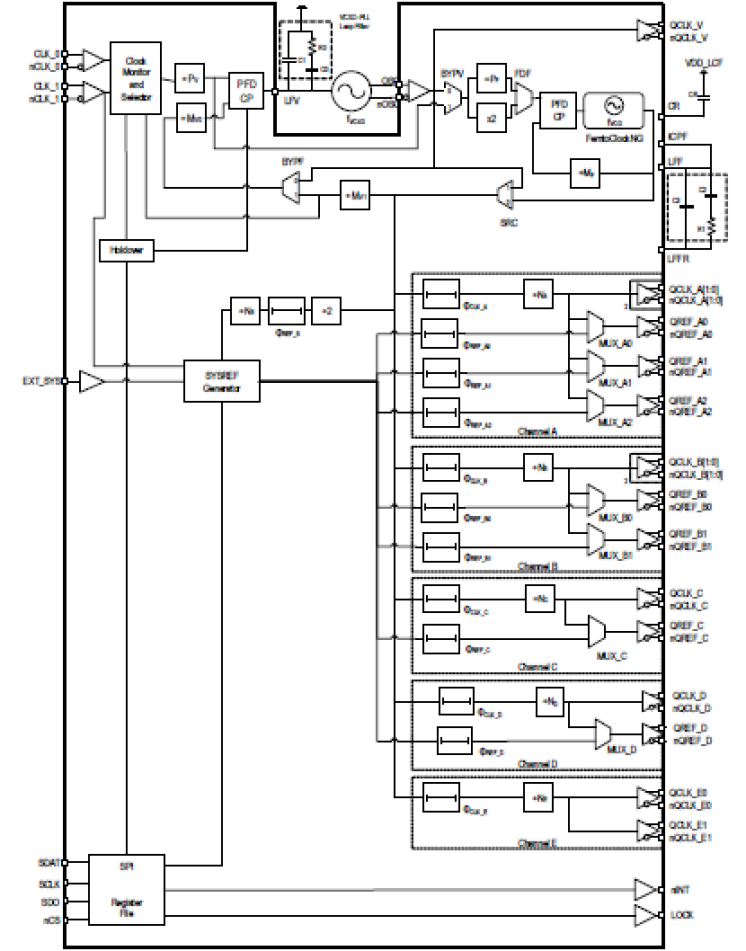 The device supports JESD204B/C subclass 0 and 1 clocks. A two-stage PLL architecture supports both jitter attenuation and frequency multiplication. The first stage PLL is the jitter attenuator and uses an external VCXO for best possible phase noise characteristics. The second stage PLL locks on the VCXO-PLL output signal and synthesizes the target frequency.