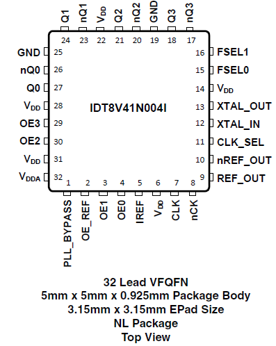 The 8V41N004I is a clock generator designed for Gigabit Ethernet, 10 Gigabit Ethernet, SGMII, and PCI Express applications. The device generates a selectable 100MHz, 125MHz, 156.25MHz, or 312.5MHz clock signal from a 25MHz input. The 8V41N004I uses Renesas' fourth generation FemtoClock® NG technology to provide low phase noise performance, combined with excellent power supply noise rejection for optimal performance in the targeted applications. The device supports a 3.3V supply voltage and is packaged in a compact, lead-free (RoHS 6) 32-lead VFQFN package. The industrial temperature range supports high-end computing, telecommunication, and networking end equipment requirements.
