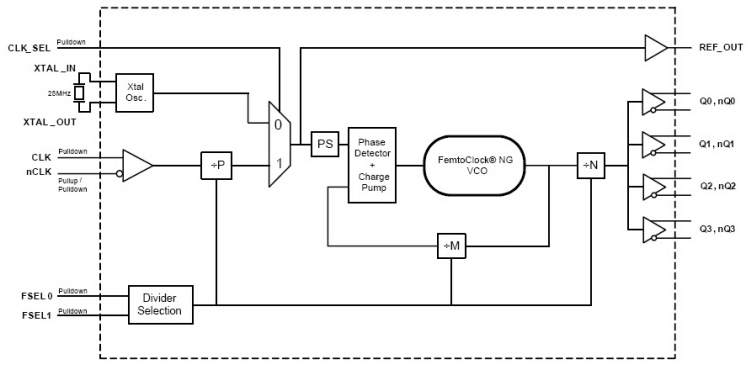 The 8V89704I is a four output Clock Generator with LVPECL outputs. The 8V89704I can generate any one of four frequencies from a single crystal or reference clock. The four frequencies are selected from the Function Table (Table 3) by two frequency selection pins. Note the desired programmed frequencies must be used with the corresponding crystal as indicated in Table 3. Excellent phase noise performance is maintained with Renesas' Fourth Generation FemtoClock™ NG PLL technology.