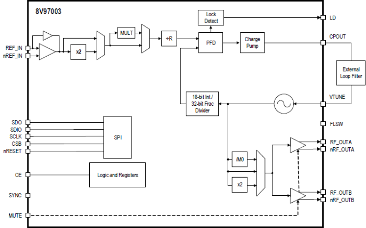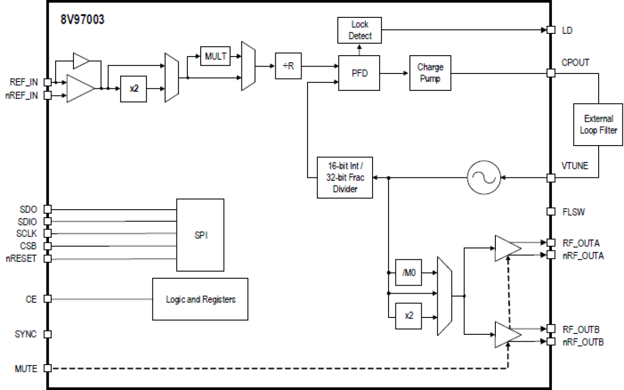 8V97003 是一款高性能宽带微波频率合成器/锁相环(PLL),通过集成压控振荡器(VCO)产生高达 18GHz 的输出频率,提供倍频程频率调谐范围。 该器件提供高性能 32 位小数反馈分频器和输出分频器,使用户能够充分利用 VCO 的宽带特性。 该器件的品质因数(FOM)为 -236dBc/Hz,VCO 性能卓越,相位噪声和 RMS 相位抖动极低。 8V97003 在所有工作条件和频率下均具有 10° 的极低输出到输出相位偏移,可减少波束成形应用(如 5G 无线电卡大规模 MIMO 系统)中无线电路径的重新校准。 输出驱动器具有可编程输出功率设置,在使用电感负载输出端(双端接)时,可在 8GHz 时提供 +12dBm 的高单端输出功率,在 18GHz 时提供 +4dBm 的高单端输出功率。 当输出为阻性负载时,输出驱动器可提供 +9.5dBm(8GHz)的单端输出功率,在 12GHz 时可提供高达 -2.5dBm 的单端输出功率。 使用差分输出和差分测量输出功率可进一步提高输出功率。 8V97003 采用 3.3V 单电源供电,提供低噪声集成 LDO,具有出色的电源抗噪能力。