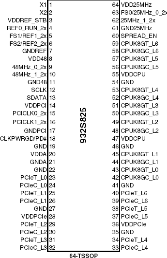 The 932S825 is a main clock synthesizer chip that all clocks required by Serverworks HT2400-based servers. An SMBus interface allows full control of the device.