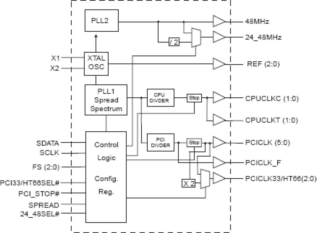- Support power management: PCI stop and stop clocks controlled by I2C.