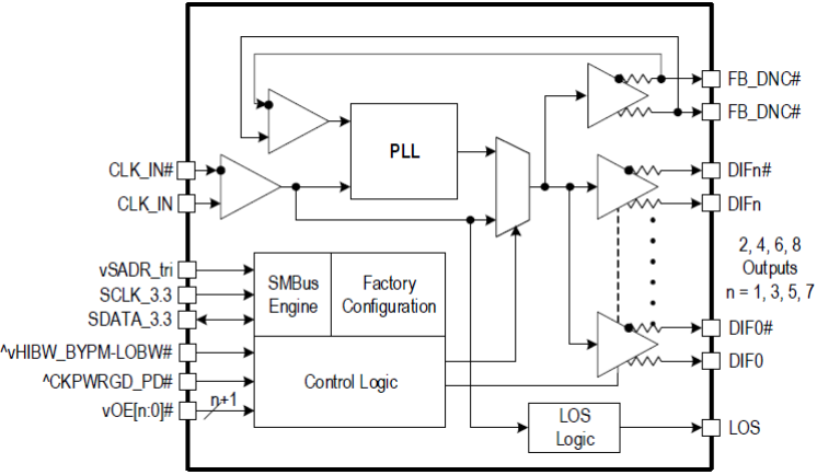- Pin/SMBus selectable PLL bandwidth and PLL Bypass; minimize phase jitter for each application