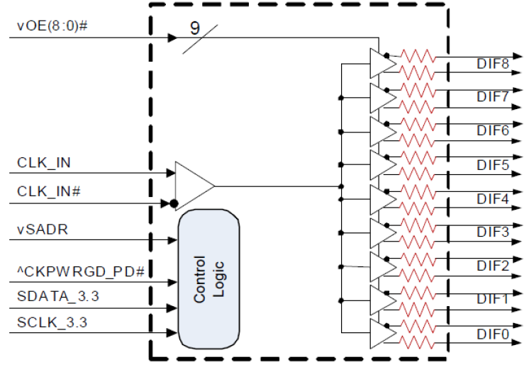 The 9DBL0951 9-output 3.3V PCIe fanout clock buffer is a member of Renesas' 3.3V full-featured PCIe clock family. The 9DBL0951 supports PCIe Gen 1-4 Common Clocked (CC) and PCIe Separate Reference Independent Spread (SRIS) systems. The device's integrated output terminations provide a direct connection to 85Ω transmission lines. The 9DBL09P1 can be factory programmed with a user-defined power-up default SMBus configuration.