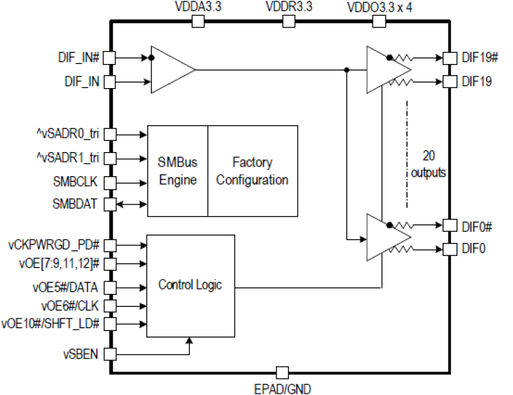 The 9QXL2001C is a 20-output very-low additive phase jitter fanout buffer for PCIe Gen1 to Gen6 applications. The 9QXL2001C provides two methods to control output enables; standard OE# pins and SMBus enable bits, and a simple 3-wire serial interface (side-band interface) that is independent of the SMBus. The side-band interface is enabled via a hardware strap and operates simultaneously with the OE# pins and SMBus enable bits. It offers integrated terminations for 85Ω transmission lines.
