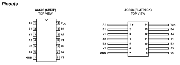 The Radiation Hardened ACS08MS is a Quad 2-Input AND Gate. For each gate, a HIGH level on both the A and B inputs results in a HIGH level on the Y output. A LOW level on either the A or B input results in a LOW level on the Y output. All inputs are buffered and the outputs are designed for balanced propagation delay and transition times. The ACS08MS is fabricated on a CMOS Silicon on Sapphire (SOS) process, which provides an immunity to Single Event Latch-up and the capability of highly reliable performance in any radiation environment. These devices offer significant power reduction and faster performance when compared to ALSTTL types. Specifications for Rad Hard QML devices are controlled by the Defense Logistics Agency Land and Maritime (DLA). The SMD numbers listed below must be used when ordering. Detailed Electrical Specifications for the ACS08 are contained in SMD 5962-95651.