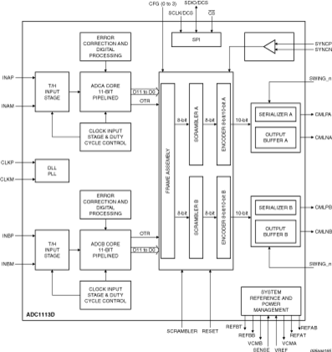 The ADC1113D is a dual channel 11-bit Analog-to-Digital Converter (ADC) optimized for high dynamic performances and low power at sample rates up to 125 Msps. Pipelined architecture and output error correction ensure the ADC1113D is accurate enough to guarantee zero missing codes over the entire operating range. Supplied from a 3 V source for analog and a 1.8 V source for the output driver, it has two serial outputs, which are compliant with the JESD204A standard. An integrated SPI (Serial Peripheral Interface) allows the user to easily configure the ADC.
