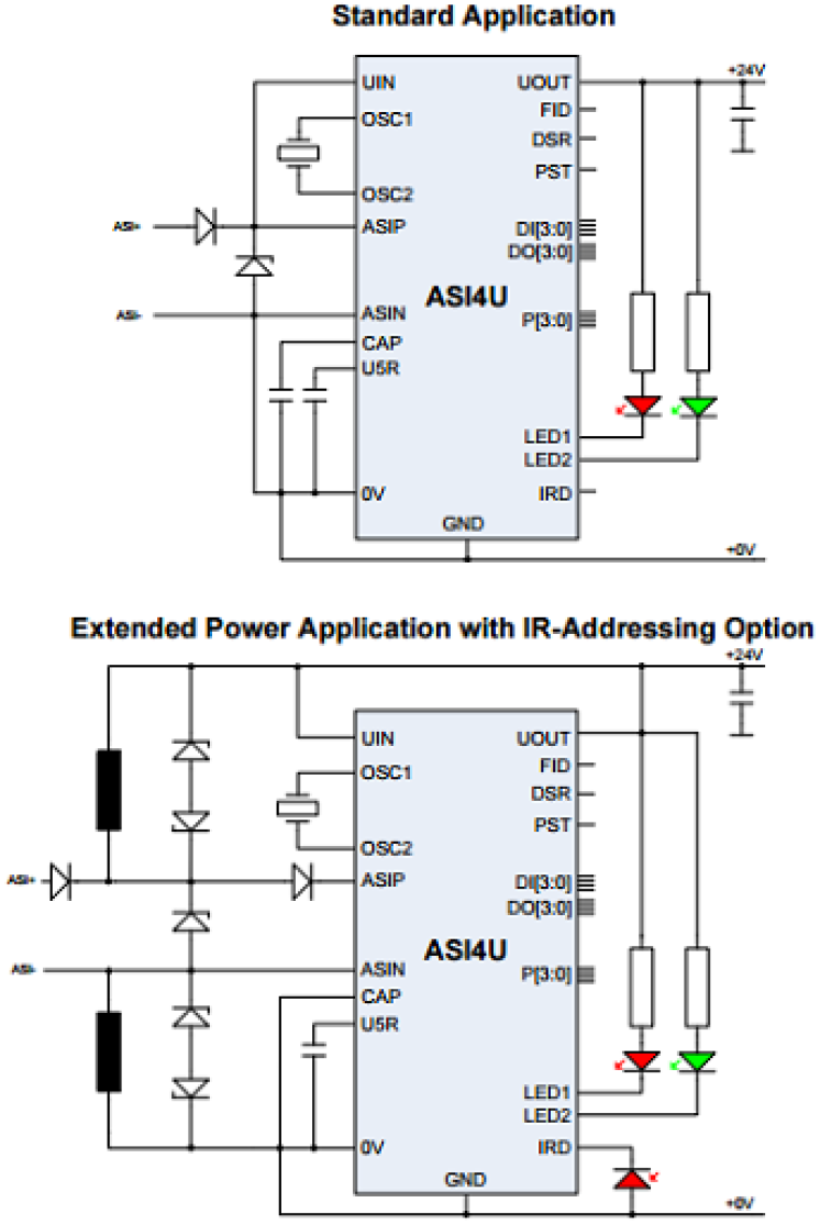 The ASI4U is a next-generation CMOS integrated circuit for AS-i networks. This low-level field bus AS-i (Actuator Sensor Interface) was designed for easy, safe, and cost-effective interconnection of sensors, actuators, and switches. It transports both power and data over the same two-wire unshielded cable.