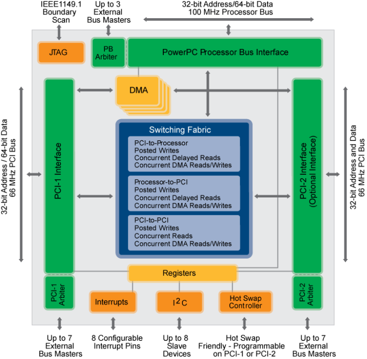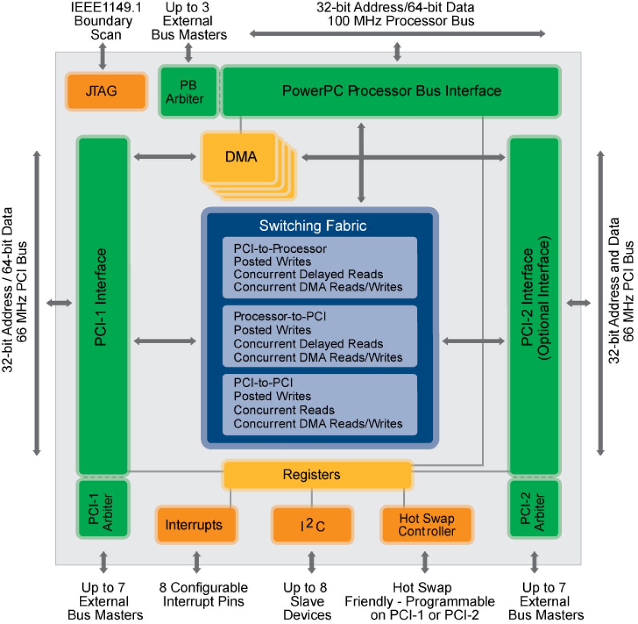 The CA91L8260B (PowerSpan II Single) is a single-port PCI bus switch that bridges PCI to the PowerQUICC II (MPC8260), MPC7xx, PowerPC™ 7xx, and PMC-Sierra WinPathT™ processors.