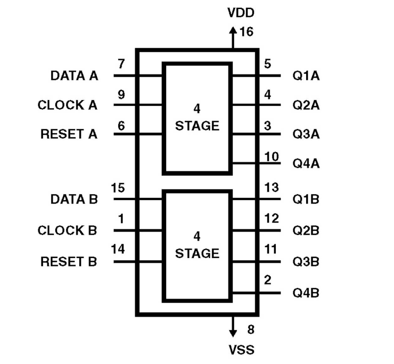 CD4015BMS consists of two identical, independent, 4-stage serial-input/parallel output registers. Each register has independent CLOCK and RESET inputs as well as a single serial DATA input. Q outputs are available from each of the four stages on both registers. All register stages are D type, master-slave flip-flops. The logic level present at the DATA input is transferred into the first register stage and shifted over one stage at each positive-going clock transition. Resetting of all stages is accomplished by a high level on the reset line. Register expansion to 8 stages using one CD4015BMS package, or to more than 8 stages using additional CD4015BMS's is possible. The CD4015BMS is supplied in these 16 lead outline packages: Braze Seal DIP H4X Frit Seal DIP H1F Ceramic Flatpack H6W
