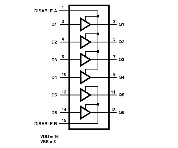 CD4503BMS is a hex noninverting buffer with 3 state outputs that have high sink and source current capability. Two disable controls are provided, one of which controls four buffers and the other controls the remaining two buffers. The CD4503BMS is supplied in these 16-lead outline packages: Braze Seal DIP H4T, Frit Seal DIP H1E, Ceramic Flatpack H6W.