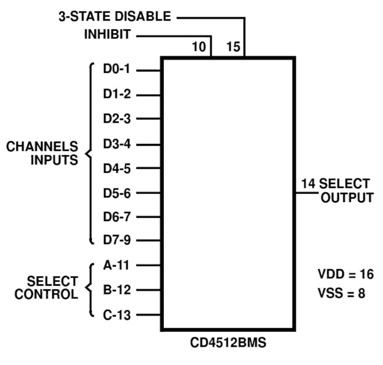CD4512BMS is an 8-channel data selector featuring a threestate output that can interface directly with, and drive, data lines of bus-oriented systems. The CD4512BMS is supplied in these 16 lead outline packages: Braze Seal DIP H4S Frit Seal DIP H1E Ceramic Flatpack H3X
