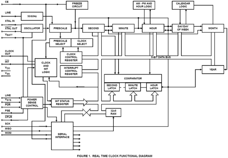 The CDP68HC68T1 Real-Time Clock provides a time/calendar function, a 32 byte static RAM, and a 3 wire Serial Peripheral Interface (SPI Bus). The primary function of the clock is to divide down a frequency input that can be supplied by the on-board oscillator in conjunction with an external crystal or by an external clock source. The internal oscillator can operate with a 32kHz, 1MHz, 2MHz, or 4MHz crystal. An external clock source with a 32kHz, 1MHz, 2MHz, 4MHz, 50Hz or 60Hz frequency can be used to drive the CDP68HC68T1. The time registers hold seconds, minutes, and hours, while the calendar registers hold day-of-week, date, month, and year information. The data is stored in BCD format. In addition, 12 or 24 hour operation can be selected. In 12 hour mode, an AM/PM indicator is provided. The T1 has a programmable output which can provide one of seven outputs for use elsewhere in the system. Computer handshaking is controlled with a wired-OR interrupt output. The interrupt can be programmed to provide a signal as the result of: