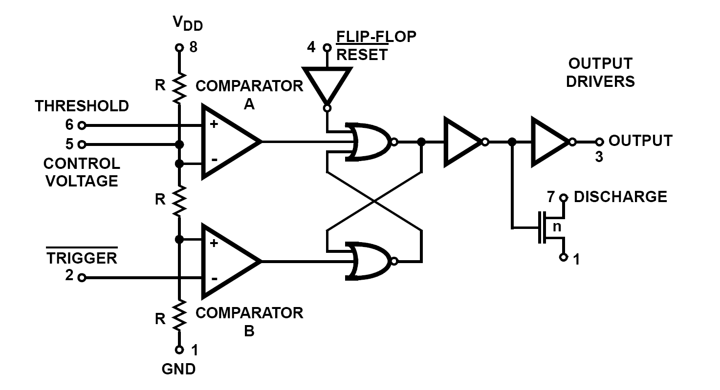 - Can be used with higher impedance timing elements than regular 555/556 for longer RC time constants