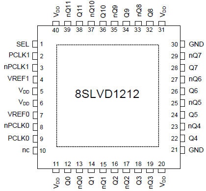 The 8SLVD1212 is a high-performance differential LVDS fanout buffer. The device is designed for the fanout of high-frequency, very low additive phase noise clock and data signals. The 8SLVD1212 is characterized to operate from a 2.5V power supply. Guaranteed output-to-output and part-to-part skew characteristics make the 8SLVD1212 ideal for those clock distribution applications demanding well-defined performance and repeatability. Two selectable differential inputs and twelve low skew outputs are available. The integrated bias voltage reference enables easy interfacing of single-ended signals to the device inputs. The device is optimized for low power consumption and low additive phase noise.