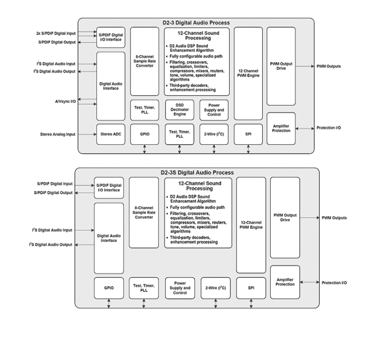 The D2-3(S) family (D2-92633-LR, D2-92634-LR, D2-92643-LR, D2-92683-QR, D2-92684-QR) of the D2-3 and D2-3S Digital Audio Processor devices are complete System on Chip (SoC) multi-channel digital sound processors and Class-D amplifier controllers. The integrated DSP provides efficient and configurable audio signal path processing including equalization, dynamic range compression, mixing, and filtering that is completely configurable using the D2 Audio Customization GUI v3 high level programming interface. The integrated PWM engine supports programmable and dynamic control of audio output, enabling a variety of multi-channel output configurations and output power capacity. Internal noise shaping, an embedded asynchronous sample rate converter, dynamic level-dependent timing, and high resolution operation support power stage audio performances with SNR >110dB and THD+N <0. 01%. The D2-3(S) devices are provided in two package and feature configurations which include the 128 Ld D2-3 family and the 72-pin D2-3S family. Both the D2-3 and D2-3S family provide identical performance and enable an extremely flexible platform for feature rich and cost-affordable quality audio solutions, which benefit from the addition of Class-D amplifiers and DSP audio processing. The 12 integrated digital PWM controllers can be used in a variety of multi-channel audio system configurations, supporting powered as well as line outputs. Fully protected amplifier control provides efficient and clean Class-D power output support.