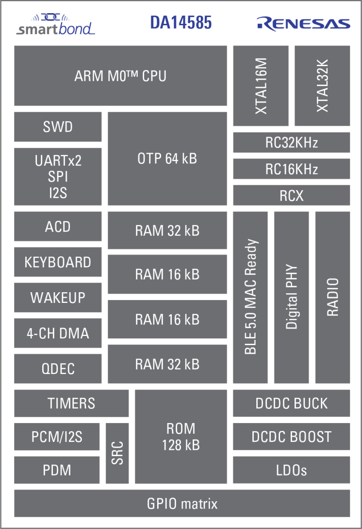 作为 SmartBond 系列的产品,DA14585 是目前体积最小、功耗最低、集成度最高的蓝牙® 解决方案之一。 这款多功能片上系统 (SoC) 是为遥控器、感应标签、信标、互联医疗设备和智能家居节点等产品添加低功耗蓝牙 (LE) 的理想之选。 支持蓝牙 5 及以下的所有蓝牙版本。 此外,DA14585 拥有 96kB 的 RAM,应用内存量是其前代产品的两倍,可充分利用标准功能。 该产品还包含一个集成的麦克风接口,以较低的附加成本提供语音支持。 宽电源电压范围(0.9V 至 3.6V)涵盖了更多的能源选择,提供了充分的设计灵活性。