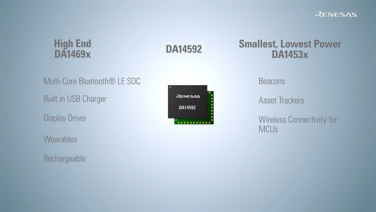 The DA14592 Bluetooth Low Energy SoC is an ultra-low power Bluetooth SoC built on an Arm® Cortex®-M33 and Arm Cortex-M0+ core with support for Bluetooth 5.4 and other proprietary ISM band protocols.